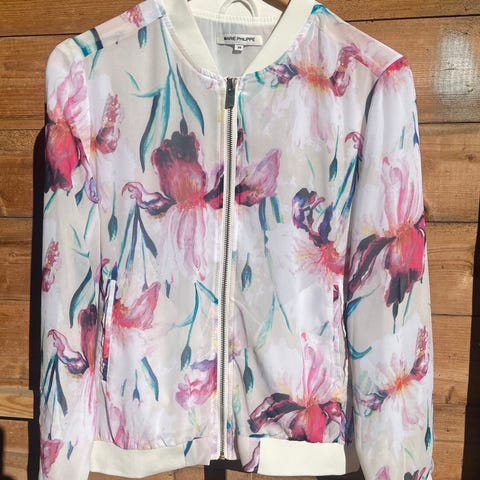 Zara, Trafaluc jakke, damejakke, jakke dame, størrelse S, S, viskose, lett jakke, overgangsjakke, fargerik jakke, mønstret jakke, trendy, moderne, casual, hverdagsjakke, pent brukt, secondhand, mote, vårjakke, sommerjakke, blomstrete, floral, bomber jacket