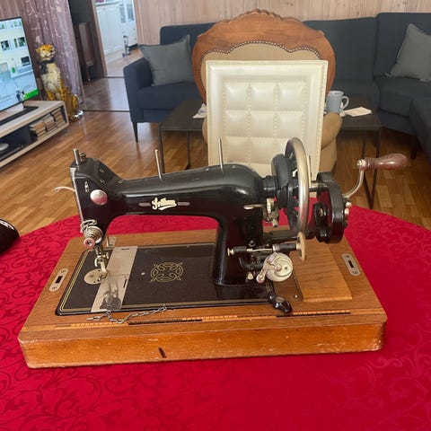 Maskinen fungerer, men har et lite problem: Under sying blir ikke undersømmen pen, og tråden kan floke seg. Dette kan trolig fikses av noen som har litt erfaring med symaskiner. Ellers er den i grei stand.