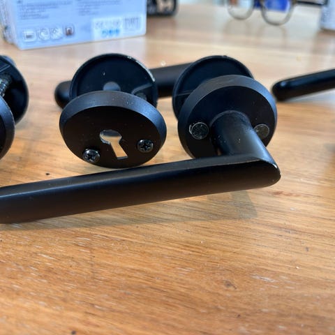 Sett med dørhåndtak, låskasse Scanlock 565 venstre, sylindere med nøkler og tilbehør i metall. Passer til standard dører og inkluderer nødvendige deler for montering og låsing.