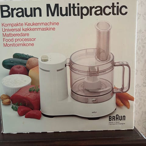 Braun kjøkkenmaskin med flere tilbehør for ulike matlagingsoppgaver. Inkluderer flere skjære- og vispeverktøy i plast og metall. Egnet for bruk i hjemmet til matforberedelser som hakking, skjæring og visping.