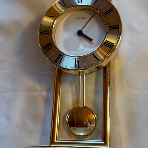 Selger en pen vintage bordklokke i krystall, produsert i Japan. Den er fra 1970-tallet og har en Art Deco-stil. Den går riktig. Klokken har en oval fasong med høyde ca 23 cm, bredde 28 cm.