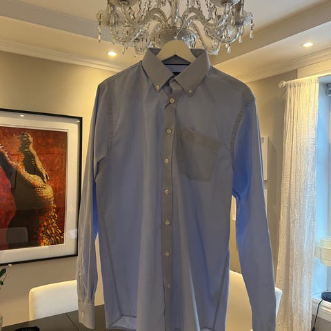 Jean Paul skjorte i blå farge, størrelse L, laget av bomull. Skjorten er designet for menn og har en klassisk knappestolpe og en brystlomme med logo.