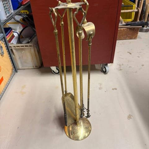 Settet inneholder stativ, ildfast tang, børste og spade.