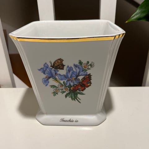 Vase med dekorativ gullkant og mønster. Passer til dekorasjon eller blomsteroppsats.