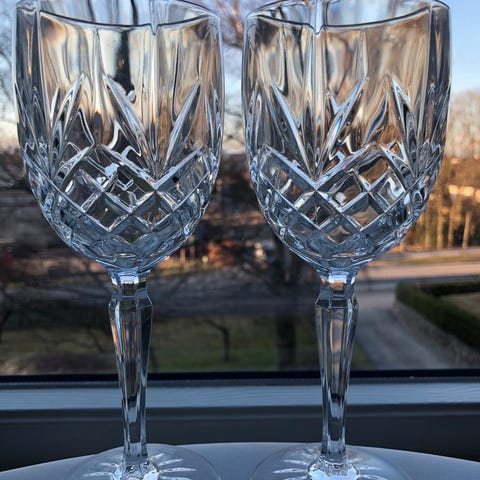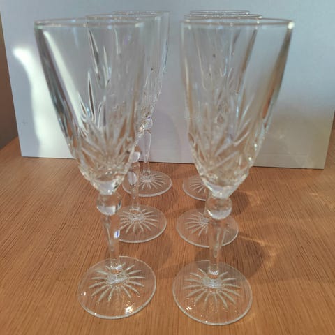 Selger seks rødvinsglass fra Cristal d'Arques, et fransk merke kjent for å demokratisere luksusen av krystallglass. Den spesifikke utskjæringen, med sitt distinkte stjernemønster og mange fasetter, er karakteristisk for deres design.