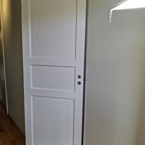 Karm u. terskel, demontert, medfølger om ønskelig. Noen skader på karm, hvitbeiset/oljet, kan slipes og males