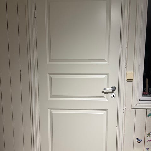 Hvit innerdør med klassisk design, inkludert dekorative paneler og messingfarget dørhåndtak. Passer for innendørs bruk i bolig.