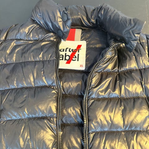 After Label Svart dunjakke for dame i størrelse S. Jakken har hette og glidelås, samt detaljer i rødt. Designet for å gi varme og beskyttelse i kaldt vær.