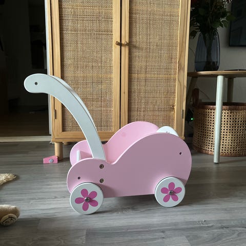 Gåvogn i god stand med gummi-dekk som ikke lager merke på gulv. Flott til gå øvelse eller lek