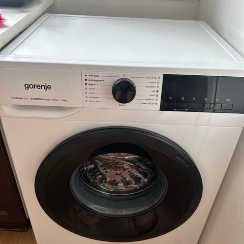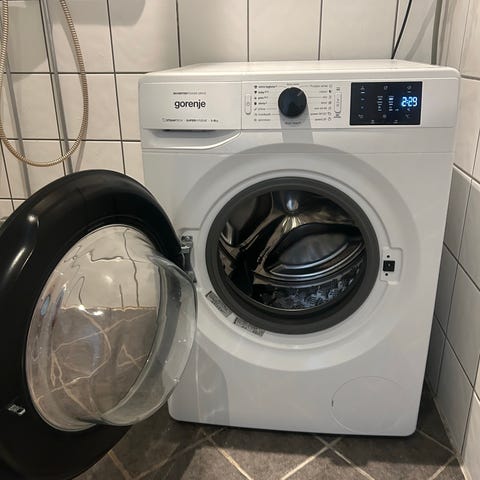 Gorenje frontmatet vaskemaskin med hvit farge og moderne design. Maskinen har et stort frontlasteområde, egnet for effektiv klesvask.