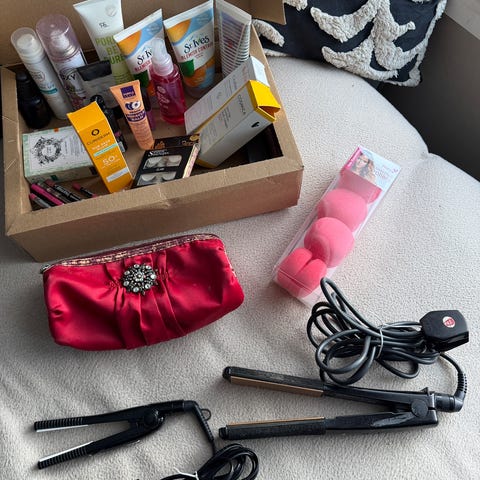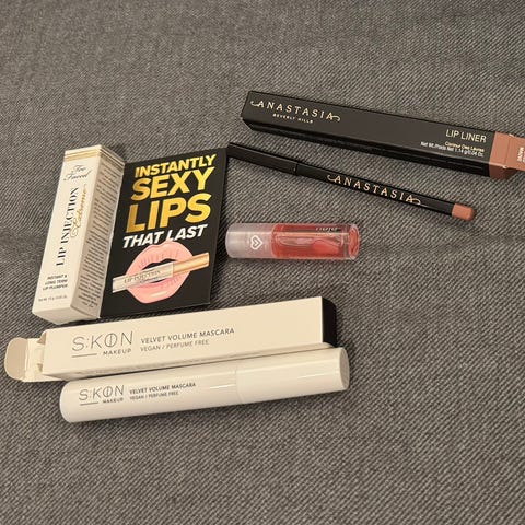 Alt er veldig lite brukt. Mascaraer er kun testet en gang,se bilde av hvor mye det er igjen på leppestiftene. Inneholder bla mac eyeliner i lilla, sky High lilla mascara, Mascara fra Natalie,bronzer fra Caia, krem fra COSRX og mye annet.