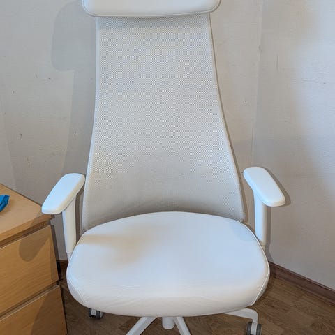 Kontorstol fra IKEA kjøpt i 2020. Med armlener, høy rygg og nakkestøtte.