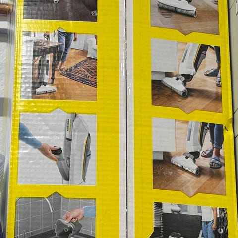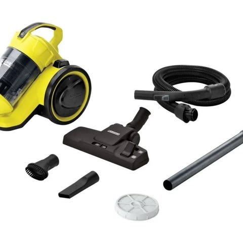 Kärcher WD 3 støvsuger med gul og svart design. Leveres med tilbehør som slange, rør og munnstykker. Egnet for rengjøring i hjemmet og verksted. Enkel å håndtere med bærehåndtak og hjul for mobilitet.