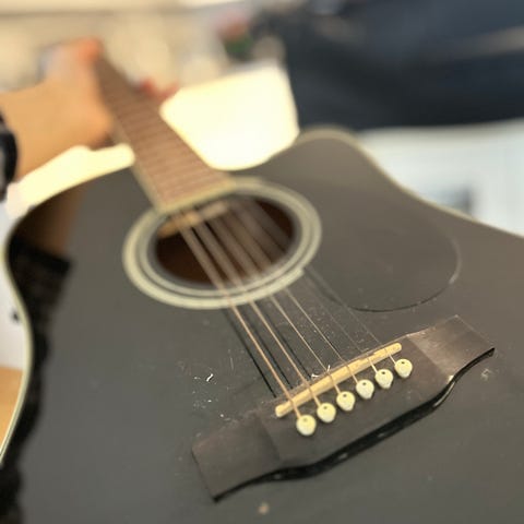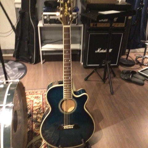 Noen som vil overta dette festival-klenodiet? Akustisk gitar med mic-system. Mangler strenger, stemmeskruer og oversadel, men ellers tipp-topp ;) Et kunstverk vil noen si, et rølpete stykke veggpryd vil andre si. Uansett, her har du et samtaleemne.