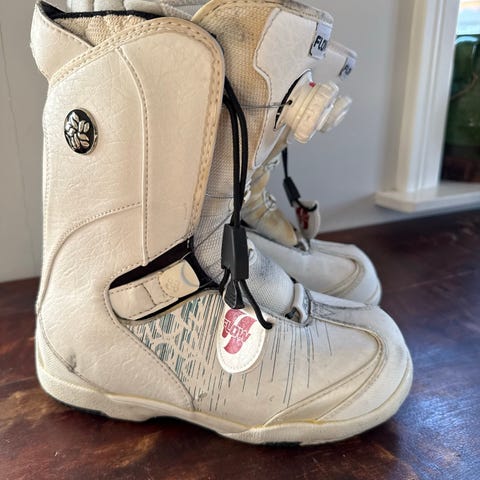 BD snowboardstøvler i grå farge, størrelse 42. Støvlene har hvite lisser og er designet for bruk ved snowboardaktiviteter.