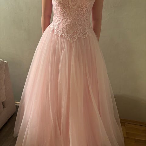Nydelig lys rosa ballkjole fra Gitzi selges, kjolen er kun blitt brukt en gang på ball og fremstår som like fin som ny. Kjolen er i str. M men den kan reguleres mye inn og ut. Stort underskjørt og tøypose til å ha kjolen i følger med.