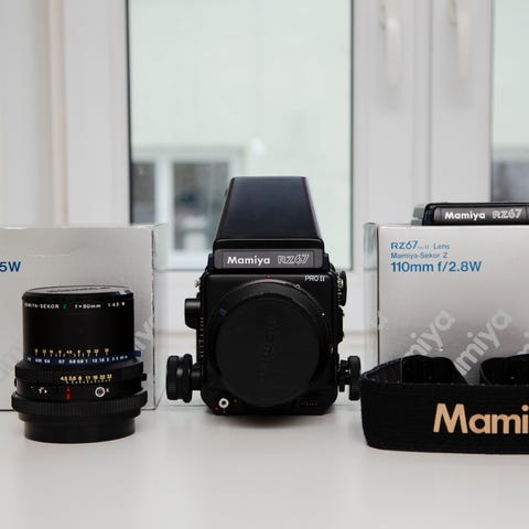 Mamiya RZ67 analog mellomformat-kamera med 50mm, 110mm, 180mm. Spesielt 110mm 1:2,8 W er hvert å trekke fram som et jevt objektiv. Det hele er i god stand med jevnlig bruk og ettersyn. Bakstykket fikk ny lyssetting i fjor hos CT-Kameraservice i Tyskland. Det er for øvrig fra et PRO I-kamera. Det følger også med bærerem, solblender og kompendium.