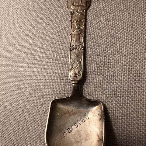 Selges som NY sølv skje i 40gr sølv med dekorative motiver som inkluderer vikingskip, norsk flagg og andre nasjonale symboler. Skjeen er laget av sølv og har detaljerte utskjæringer på håndtaket. Passer til samling eller bruk som suvenir.
