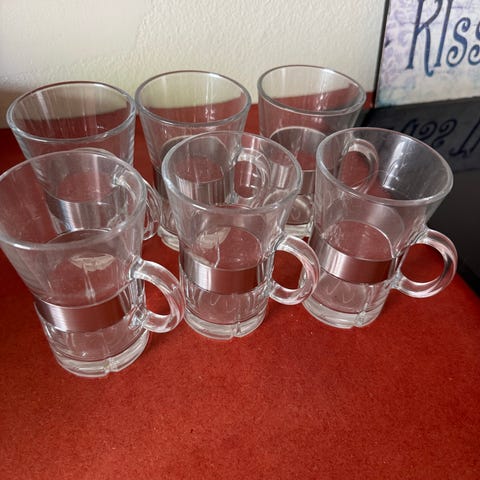 Fire høye krus for både varmt og kaldt drikke. Rommer 3,5 dl og er 14 cm høye. Har også fire til, om noen evt vil ha fler. De er nye og har ikke vært brukt. Prisen er for fire.