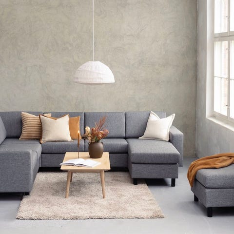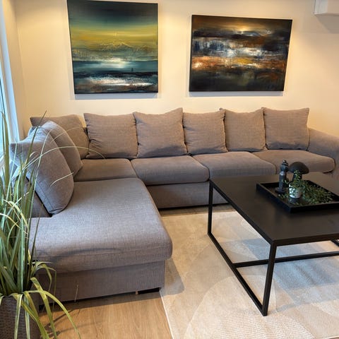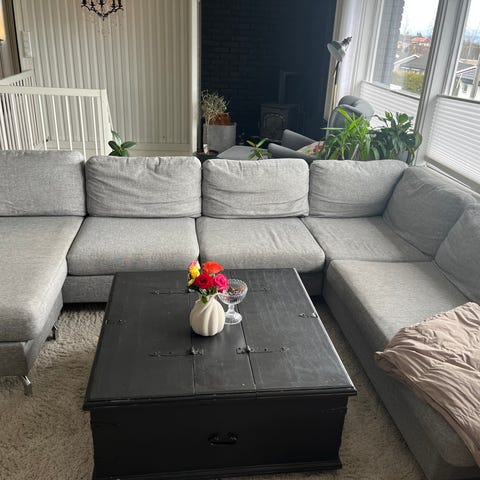 Skeidar hjørnesofa i lys grått stoff. Sofaen har et hjørneoppsett som gir god sitteplass og passer til stue eller oppholdsrom. Stoffmaterialet gir en nøytral og lys farge som kan kombineres med ulike interiørstiler.