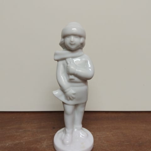 Figur i hvitt porselen med hat, kåpe og støvler som holder en paraply. Figuren står på en rund sokkel med filt og har en glatt, blank overflate.