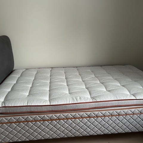 Sengen har stått i hjørnet, derav venstre endestykke annerledes (se bilde).