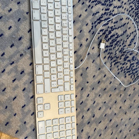 Apple Tilleggsutstyr bestående av et tastatur og en kabel. Produktet har hvit og sølvfarget design, og er beregnet for bruk med kompatible Apple-enheter.