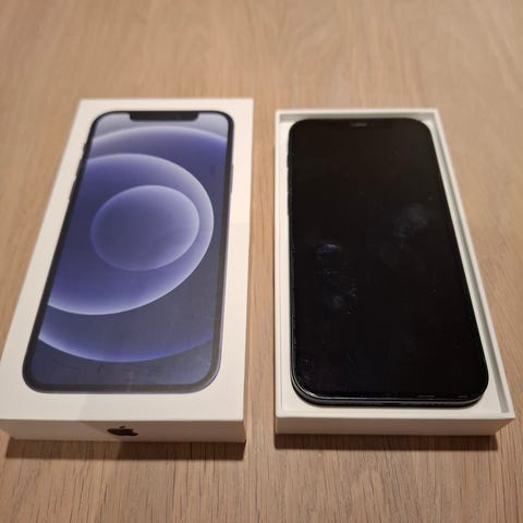 Hvit apple iPhone 12 mobiltelefon med 64 GB lagringskapasitet. Og dårlig batterikappasitet, det står service. Jeg byttet skjerm på telefonen for litt over en måned siden og klarte å knuse den nettop igjen. Selges derfor billig. Bare ta kontakt om du lurer på noe