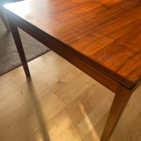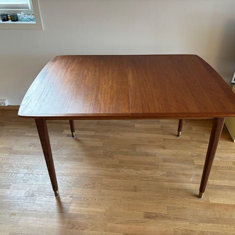 Retro teak bord. Dette kan bli veldig fint om tar seg tid til å fjerne lakken oppe på bordet. En del merker som sitter i lakken.