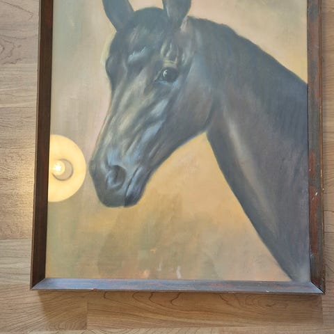 Kunsttrykk med motiv av en hest i sterke, fargerike nyanser. Bildet er innrammet i en svart ramme. Passer til dekorasjon i hjem eller kontor.