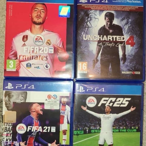 Playstation 4 spill inkludert FIFA 15, FIFA 16, FIFA 17, Call of Duty Black Ops III, Grand Theft Auto V, og FIFA 19.