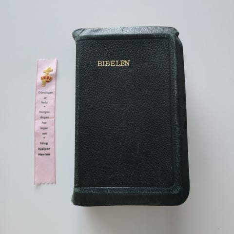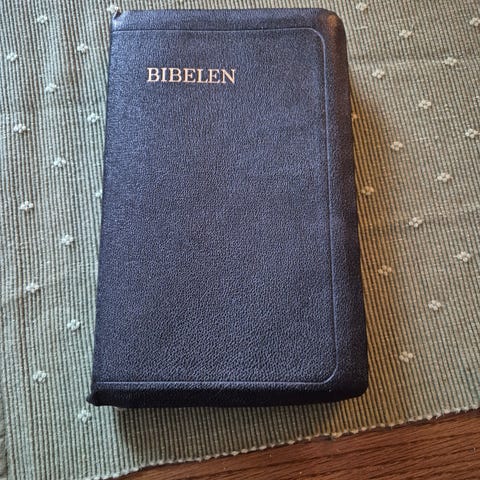 Fin bibel med gull dekor på skrift og perm.