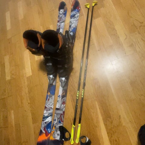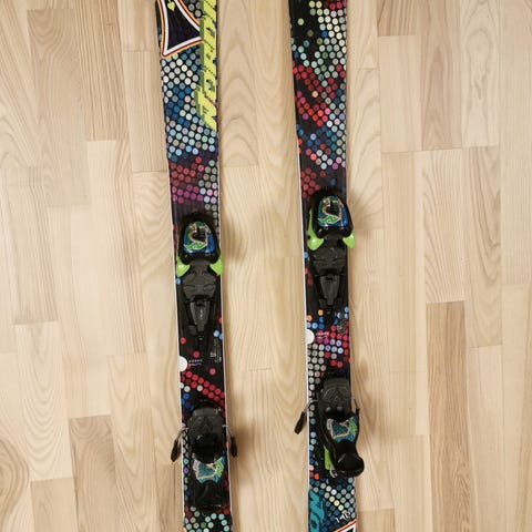 K2 twintip ski Jr 116cm med Marker bindinger med justerbar størrelse. Fargekombinasjon i grønt, svart og hvitt. Egnet for park.