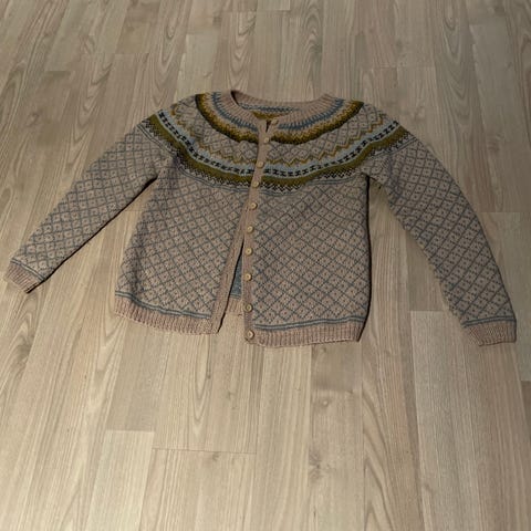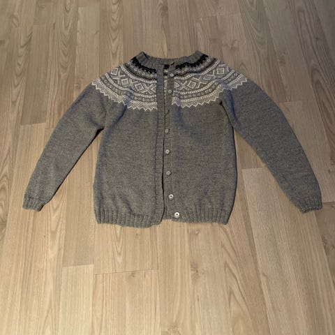 Chunky knit, hjemmestrikket ullgenser i en fin burgunder/vinrød farge. Genseren er oversized og har ballongermer. Den er nesten ikke brukt, og holder fasongen fint.