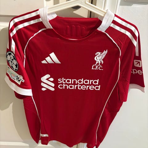 Liverpool fotballdrakt Player Version i hvit og rød farge. Størrelse M. Drakten har Premier League-logo på ermet og Wirtz på ryggen. Materialet er pustende og egnet for sportsbruk. Kjøpt på dhgate.