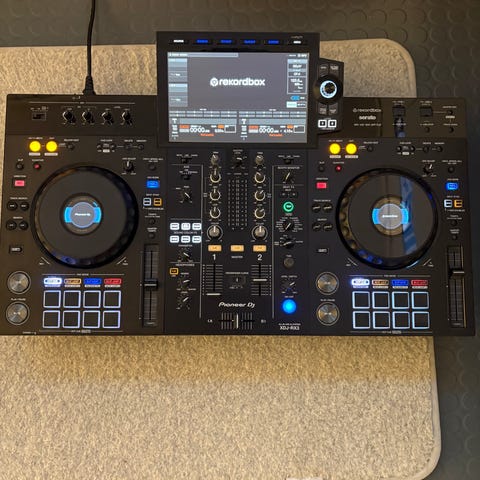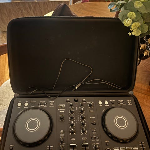 Pioneer DDJ-FLX4 DJ-kontroller i svart farge. Utstyrt med to joghjul, flere justerbare knapper og skyvebrytere for kontroll av lyd og miksing. Passer for DJ-er som ønsker en kompakt og funksjonell enhet for musikkmiksing. Lite brukt, ingen bruksmerker. Mangler originaleska. Pris kan diskuteres.