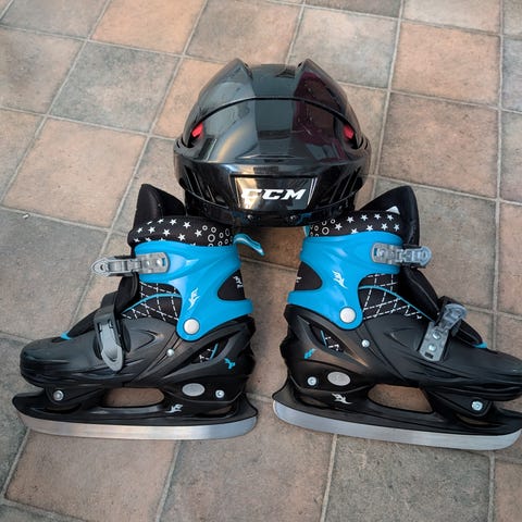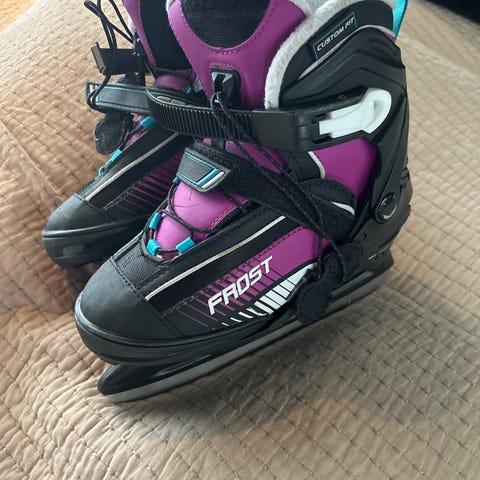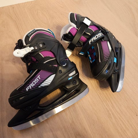 Fine Frost skøyter i størrelse 36-40 selges. Skøytene er sorte, blå og hvite, og justeres til den størrelsen man ønsker.