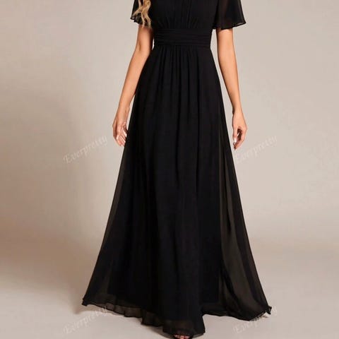Selger en nydelig, lang kjole i dus grå/grønn tone med fine blonde detaljer i livet og på skuldrene. Kjolen har lange ermer, flatterende V-utringning og lett, flytende stoff som faller pent. Veldig behagelig å ha på og passer perfekt til bryllup, forlovelse, fest eller andre formelle anledninger.