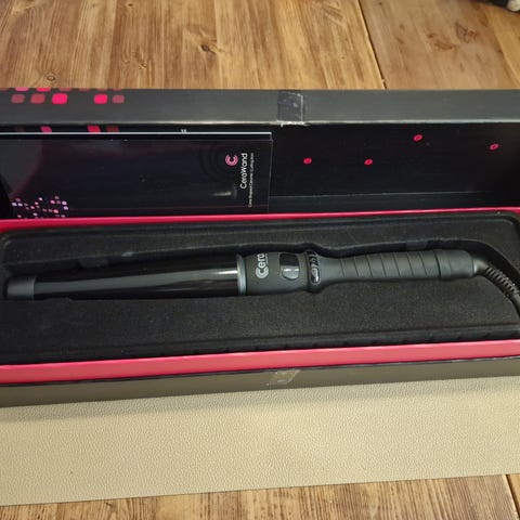 Cera Curling Wand med konisk tangeringsstang på 19-32 mm. Utstyrt med keramiske plater og digital temperaturkontroll med arbeidsområde mellom 80-210 grader. Varmer opp til ønsket temperatur på cirka 15 sekunder. Leveres med 3 meter ledning og veier 210 gram.