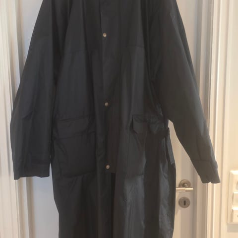 Sort, stor refleksstripe på ryggen og refleksmerke foran. Ikke mye brukt. Tykt, kraftig «regntøystoff».
