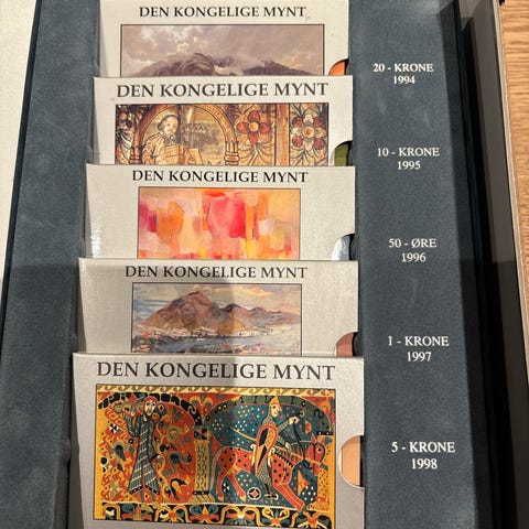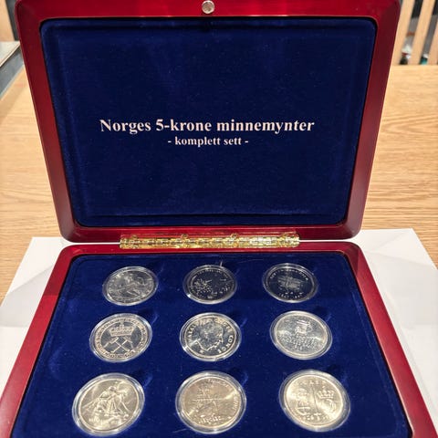 Norges 5-krone minnemynter komplett sett med ni mynter i et oppbevaringsetui. Myntene viser ulike motiver og årstall, inkludert skip, blomster og portretter.