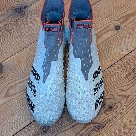 Adidas Predator fotballsko i blå og sort farge. Skoene har en design som egner seg for bruk på kunstgress og andre harde underlag. De er utstyrt med knotter for godt grep og stabilitet under spill.