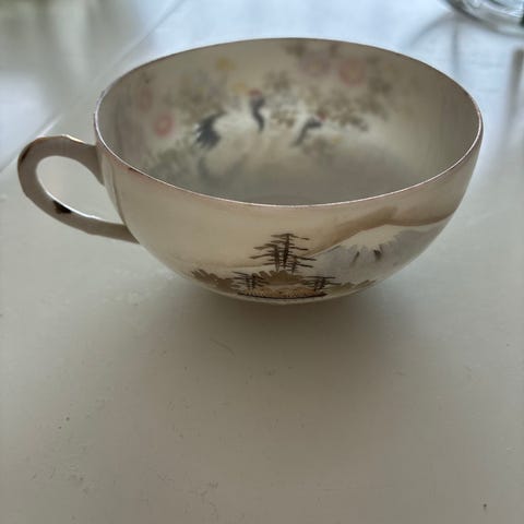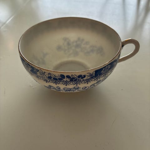 «Under glazed blue» med motiv av vindmølle og båt. Trolig Japansk porselen.