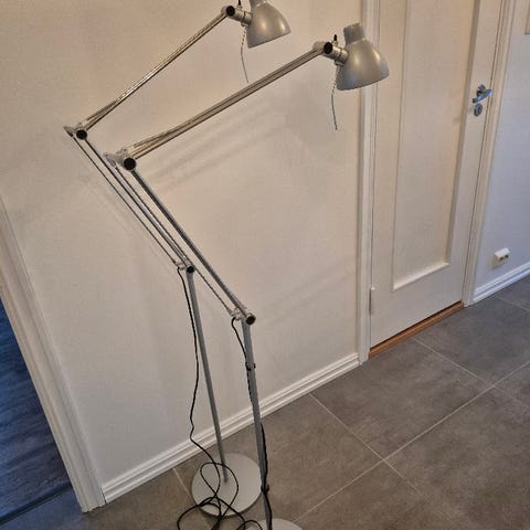 Selger en elegant og nyere variant av trafikk lampen. Den er et par år gammel og i god stand. Noe bruksmerker men fungerer utmerket. Gulvlampen er sort og har tre bevegelige armer og en bryter på hver enkelt arm. Gir både et dekorativt lys og fungerer bra som leselys. Jeg har bare brukt den med to skjermer og en dekorativ lyspære. Skjermene er kremfarget.