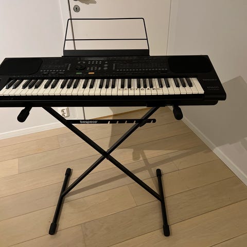 Passer godt til barnerommet eller kjellerstuen. Det finnes utgang for hodetelefon.Stativet er ganske nytt,og er i praksis det man betaler for.Instrumentet er lett å stuve vekk.Instrumentet må hentes.