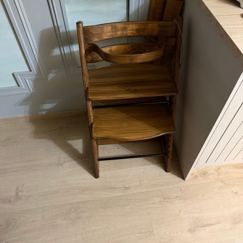 Stokke barnestol i tre med tilbehør som setepute og sikkerhetssele. Stolen er designet for barn og har en naturlig trefinish. Seteputen er polstret for komfort, og sikkerhetsselen gir ekstra støtte ved bruk.