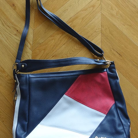 Bagen / Vesken har en kombinasjon av svart og rødt materiale med glidelåsdetaljer. Egnet for bruk under reiser eller til oppbevaring.