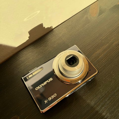 Olympus FE-210 digitalt kamera, kan filme 🙂. Batteriluka er litt løs, så den må teipes eller holdes fast så kameraet ikke skrur seg av, selges derfor billig. Skikkelig Y2K / sent 90-tallslook på bildene med dette kameraet, spesielt med blitzen på innendørs. Bruker AA-batterier så man trenger ikke tenke på å ha med lader på tur.