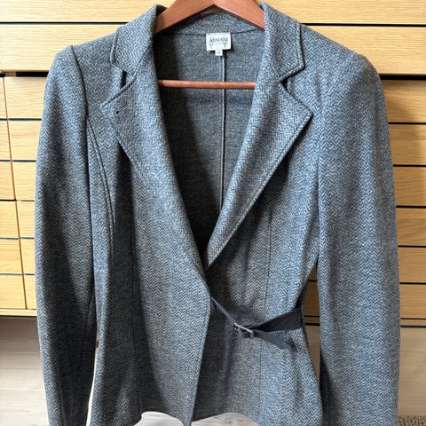 Klassisk double-breasted blazer i ull. Fiskebenmønster. Minimalt brukt. Som ny. Str 34.