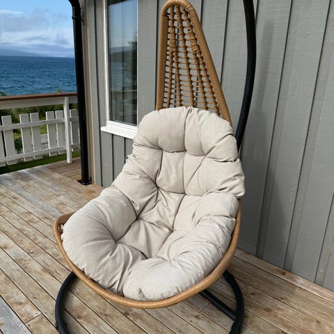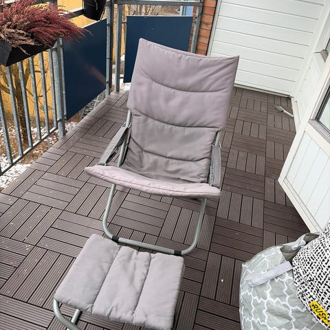 Puter er i hvitt med vaskbart trekk, noen merker fra teak oljen på undersiden men blir borte i regnet.
